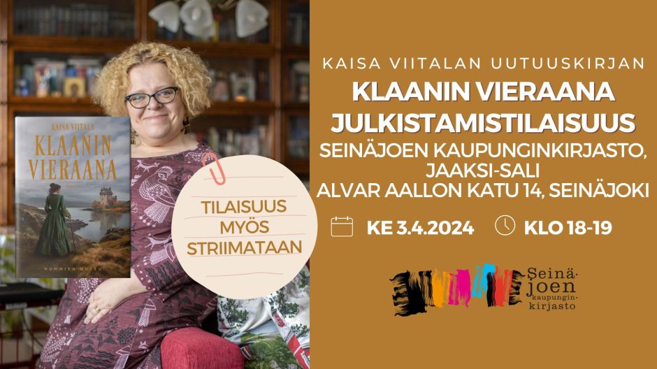 Olet sydämellisesti tervetullut Klaanin vieraana -kirjan julkistamistilaisuuteen paikan päälle Seinäjoen pääkirjaston Jaaksi-saliin (esteetön kulku) ke 3.4. klo 18-19. Ellet pääse paikalle, voit seurata tilaisuutta suorana lähetyksenä Seinäjoen kaupunginkirjaston YouTube-kanavalla.