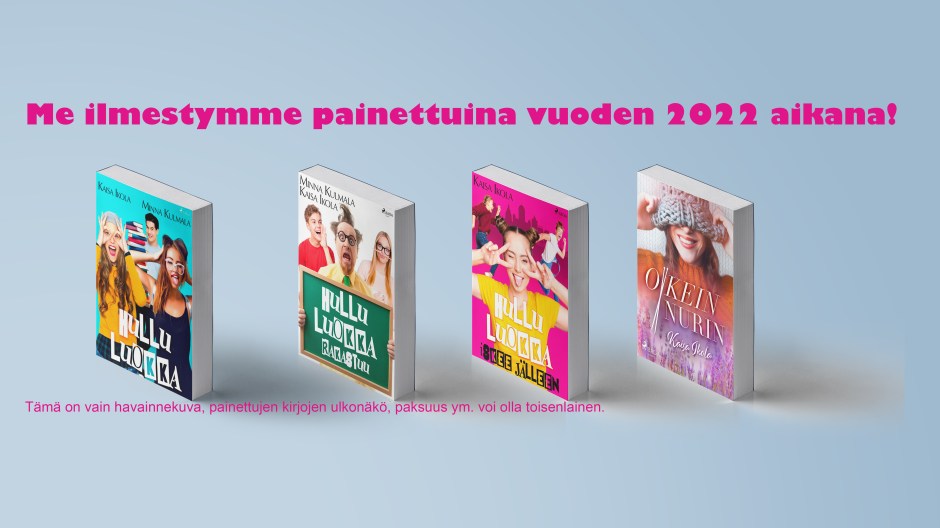Se on kuitenkin jokaisen lukijan oma asia, missä muodossa kirjansa haluaa nauttia. Ja tiedän, että monet lukevat mieluiten painettua kirjaa. Siksi olenkin iloinen saadessani kertoa, että vuoden 2022 aikana ilmestyvät painettuina Oikein nurin, Hullu luokka, Hullu luokka rakastuu ja Hullu luokka iskee jälleen.